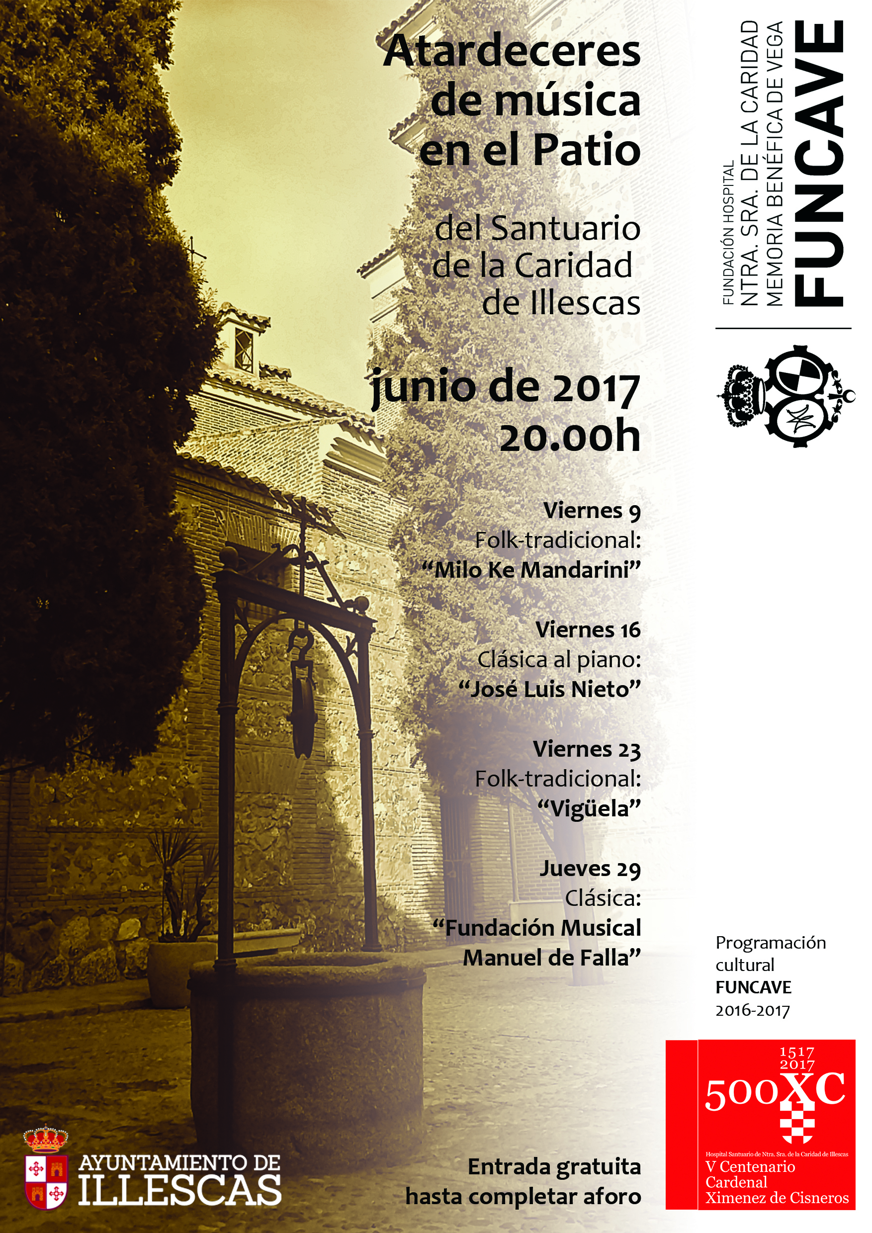 El mes de junio es un mes ideal para disfrutar de la música al aire libre, por eso desde FUNCAVE en colaboración con el Excmo. Ayuntamiento de Illescas, te proponemos disfrutar de conciertos de música clásica y tradicional en el Patio del Santuario. Consulta aquí los días y las horas de los diferentes conciertos.