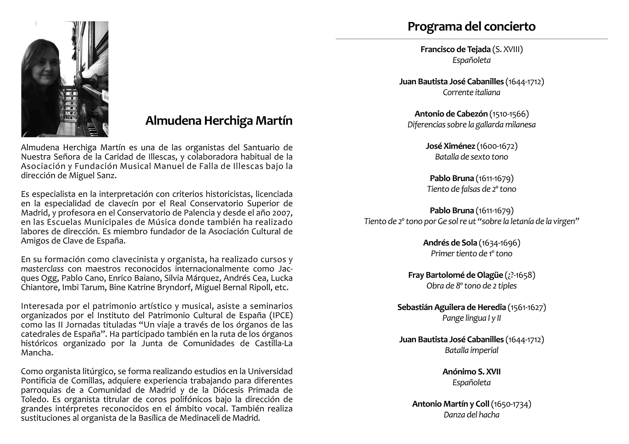 Almudena Herchiga Martín es una de las organistas del Santuario de Nuestra Señora de la Caridad de Illescas, y colaboradora habitual de la Asociación y Fundación Musical Manuel de Falla de Illescas bajo la dirección de Miguel Sanz.