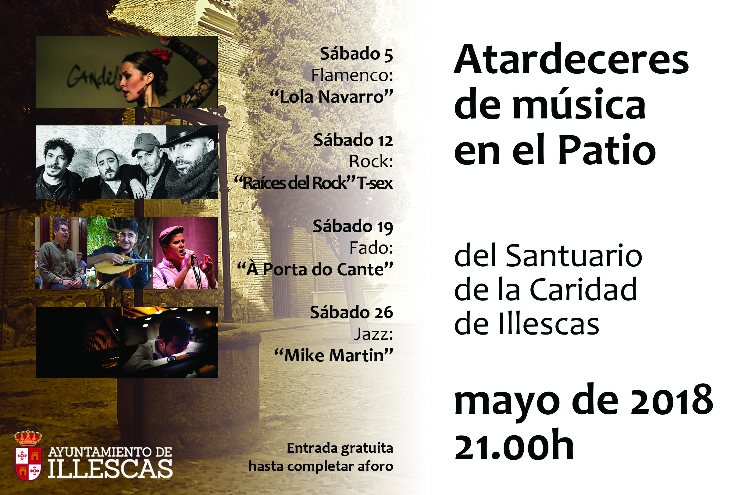 En esta ocasión los conciertos se celebrarán todos los sábados de mayo a las 21:00 horas, donde se podrá disfrutar música de diferentes estilos como flamenco, Rock, Fado y Jazz, entre los que se encuentran artistas y grupos musicales de la localidad.