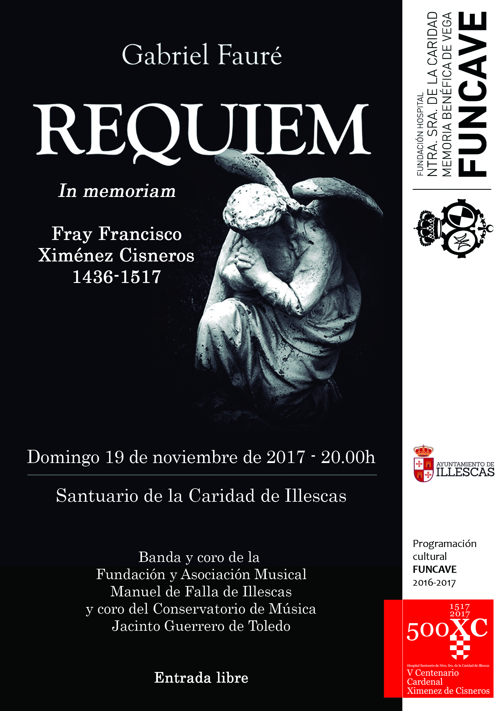 FUNCAVE y el Excmo Ayuntamiento de Illescas presetnan el REQUIEM de Gabrile Fauré In memoria del Cardenal Cisneros en el V Centenraio de su muerte. Será interpretado por la Asociación Musical "Manuel de Falla" de Illescas y el coro "Jacinto Guerrero" de Toledo. Próximo domingo 19 de Noviembre a las 20:00 horas en el Santuario de la Caridad de Illescas.